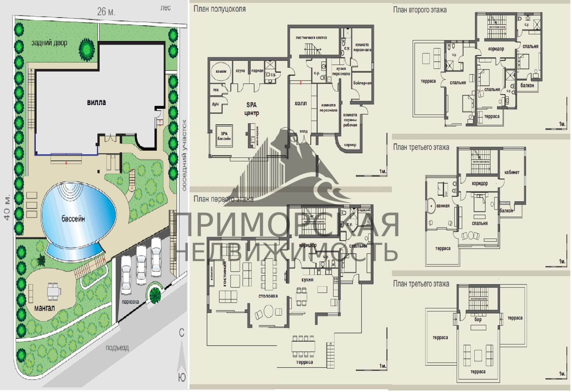 Системы полива, охраны, энергоконтроля полностью автоматизированы, что позволяет уйти от постоянного содержания обслуживающего персонала. В доме расположены: 5 спален, кабинет, гостиная с каминной зоной, кухня-столовая, SPA центр, хозяйственно-бытовой блок. Все основные помещения имеют собственные террасы.