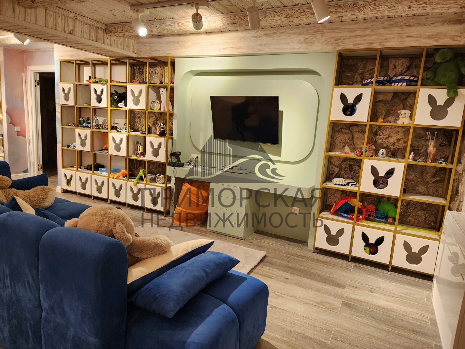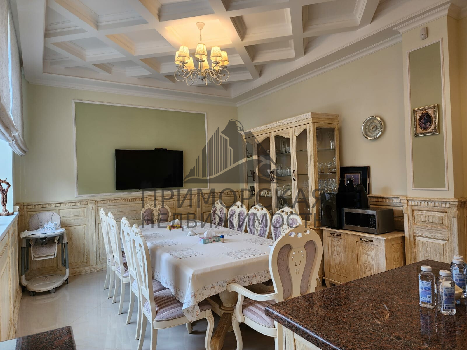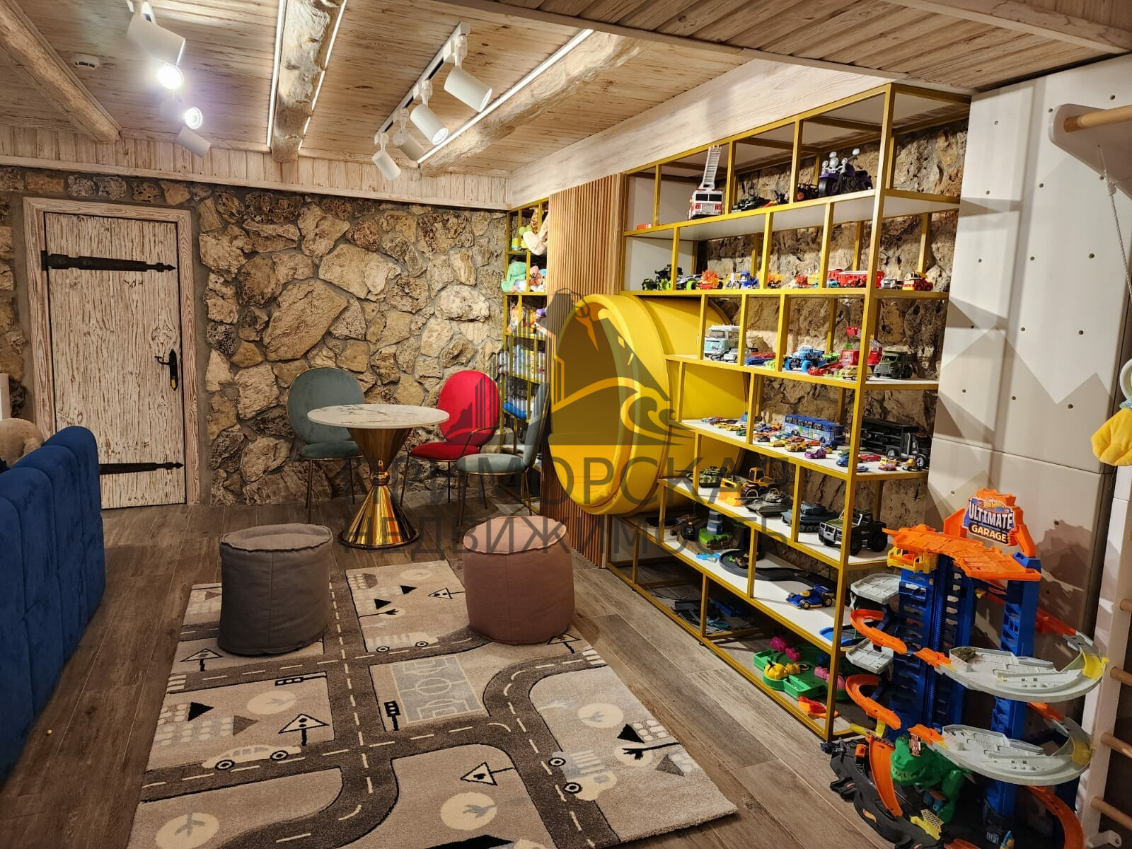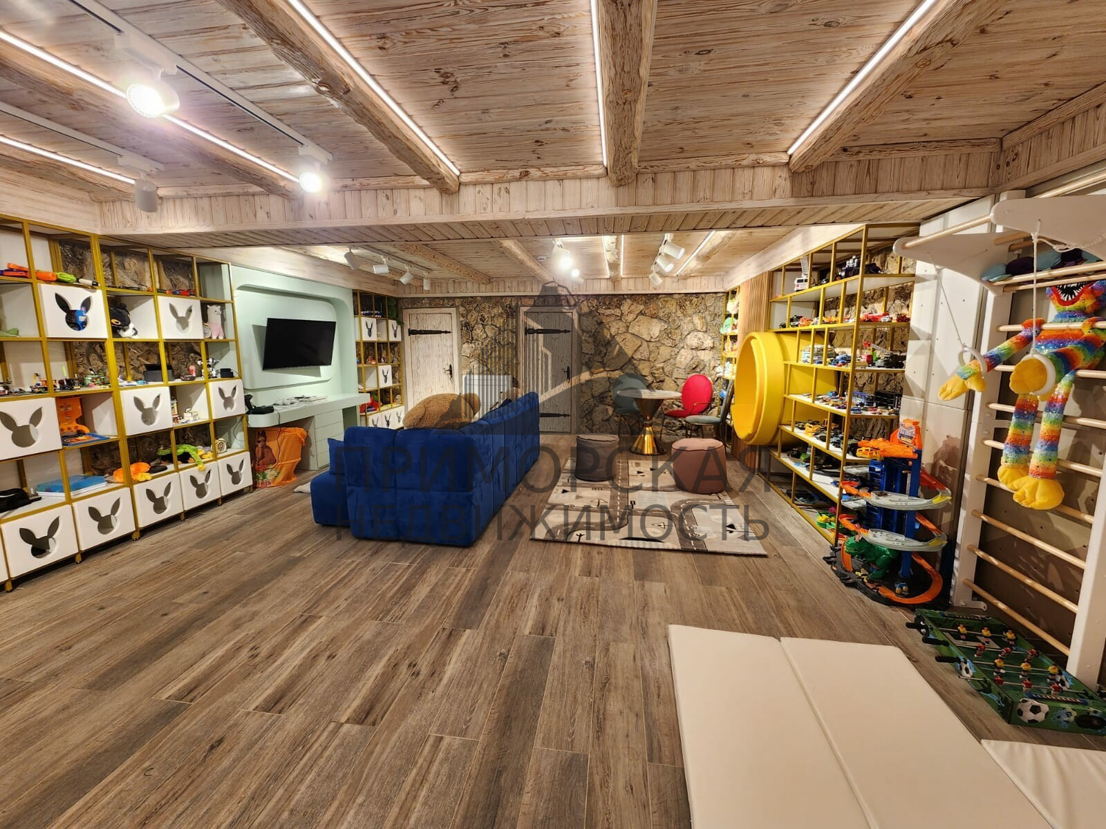 Цокольный этаж: 1 спальня с санузла и гардеробной и кухня студия -для обслуживающего персонала Игровая детская комната из неё выход в прачечную и винную комнату. Бойлерная с оборудованием для фильтрации и очистки воды, газовые котлы для отопления.