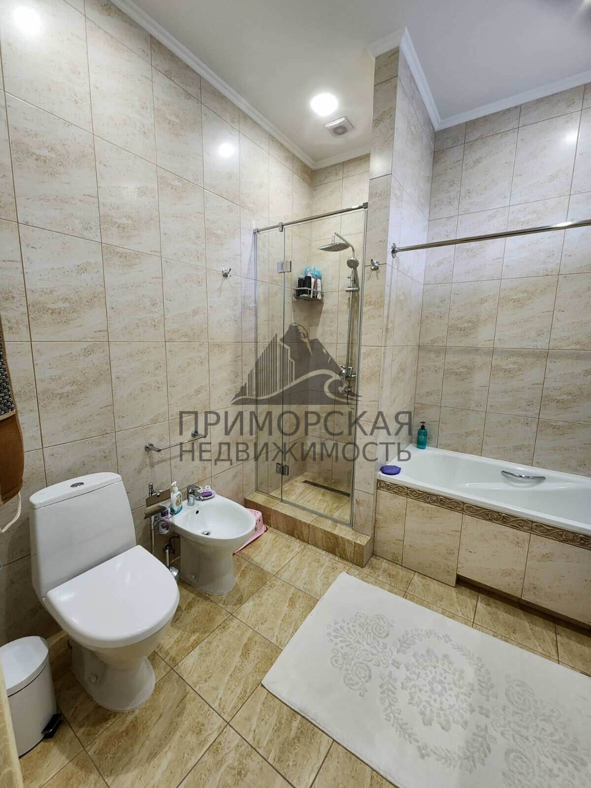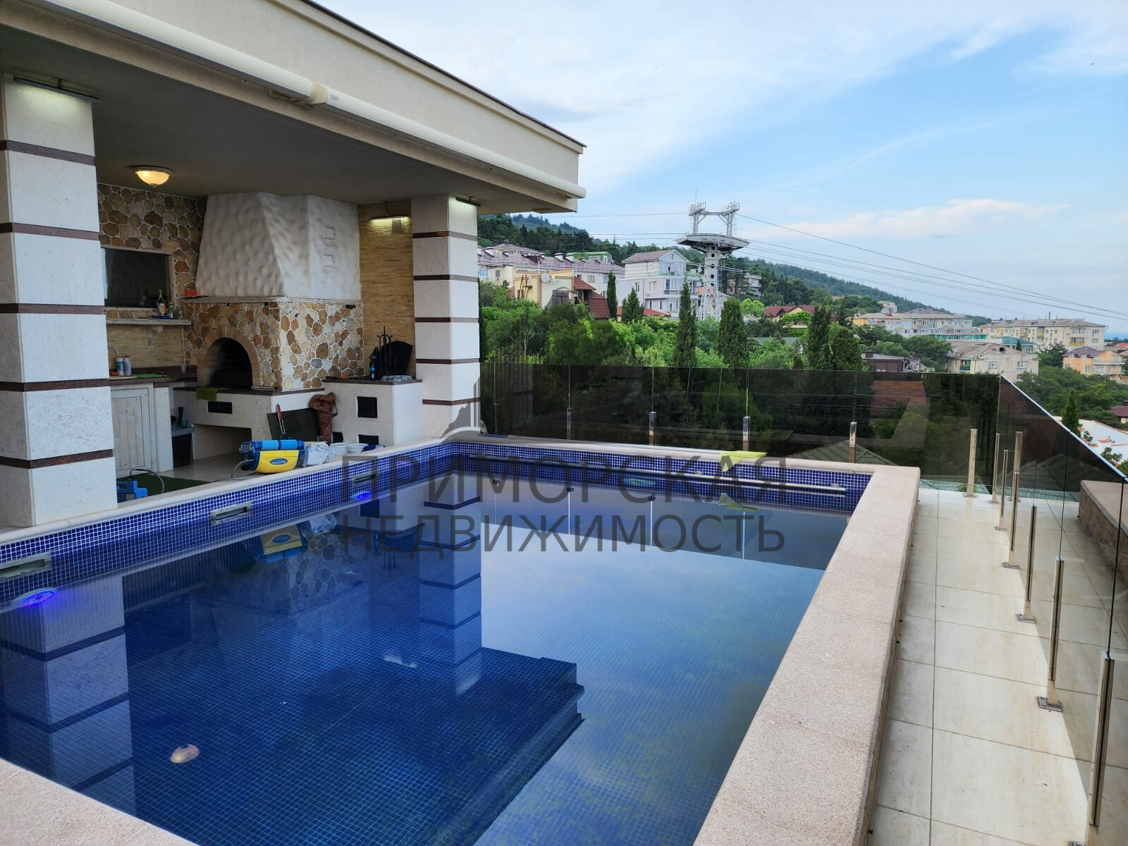 3 й этаж: -Сауна с туалетом и душем, спальня с санузлом и выходом на главную террасу к бассейну, терраса с бассейном, мангалом, духовой печью, с зоной отдыха. Коммуникации: Также есть отдельно стоящий гостевой дом : 2 комнаты студии с кухней, и 2 сан узла в каждой комнате, под ними гараж на 2- 3 машины.