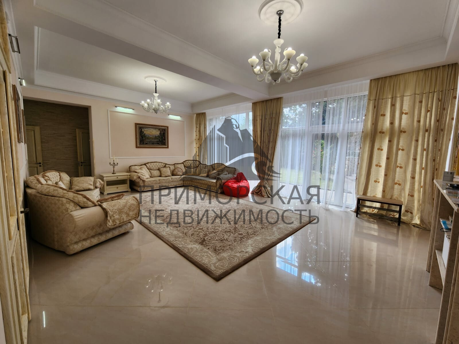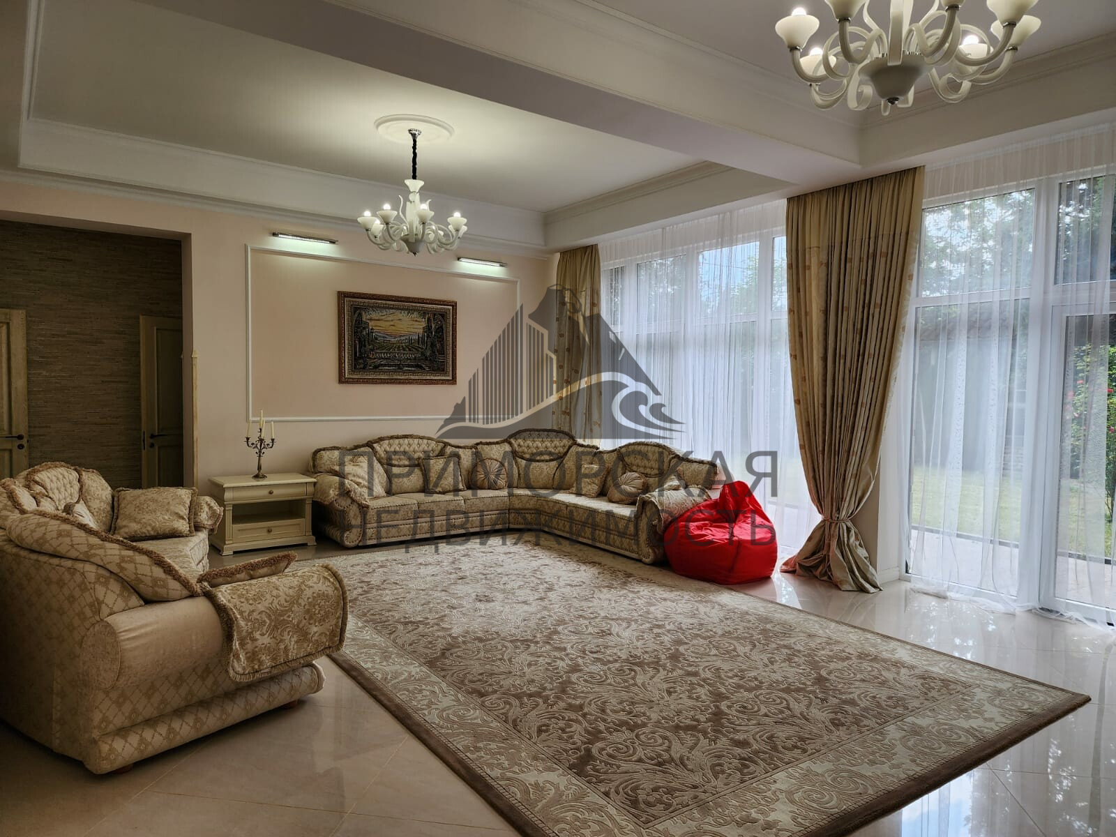 1-й Этаж: Большая просторная гостиная с выходом к лужайке на беседку. Кухня столовая. -2 спальни с санузлами и выходом на балконы.